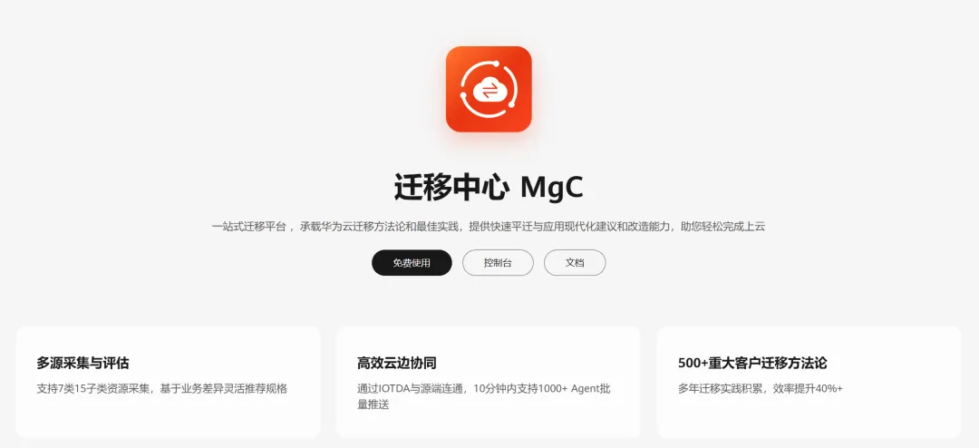 华为云迁移中心 MgC,就是为此而生的一站式迁移平台。它承载了华为云多年的迁移方法论和最佳实践,已经成功服务了神州专车、金蝶等 500+ 重大客户。