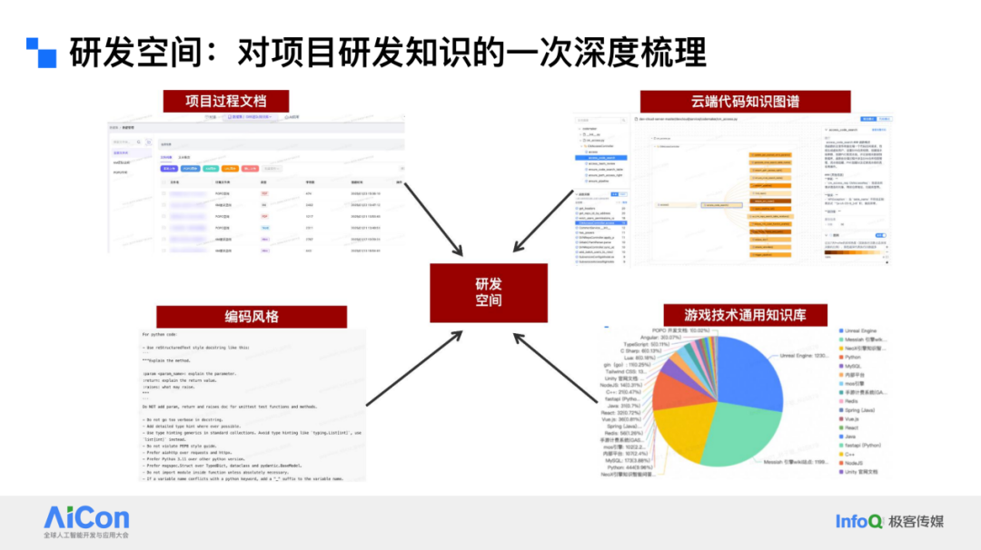 在游戏研发过程中,如何更好地理解代码及其背景知识,是我们一直在探索的问题。在这个过程中,我们逐步构建了一套游戏研发知识工程体系。一个游戏团队通常涉及策划、研发、美术等多个角色,大家每天需要协同交互的问题非常多。例如,一个游戏角色的技能是什么?像最近大火的某款热门竞技类游戏,已经有数十个角色,每个角色可能有好几个技能,普通人很难全部记住,只能通过询问来获取信息。再比如,去年的中秋活动是如何实现的?如果我要设计今年的中秋活动,自然希望借鉴去年的经验。还有如何让 UI 界面背景实现毛玻璃效果,这可能涉及组件配置属性等问题。此外,开发人员和 QA 经常会因为“我改了这个东西会不会影响其他东西”而产生分歧,而这些问题的答案都藏在代码仓库里。