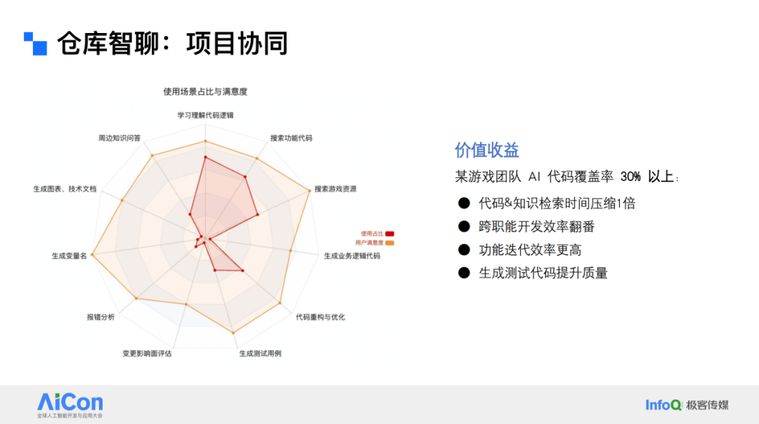 从项目协同的角度来看,虽然我们的系统最初是围绕代码生成设计的,但经过大家的探索,它现在可以用在很多方面。除了常规的生成变量名、业务代码逻辑、现有代码重构以及生成测试用例之外,它还可以用在很多创造性场景中。之前,一个内部用户偷偷告诉我,他用这个工具来写专利。这其实是一个挖掘已有内容并加以利用的过程。在实际应用中,这个工具在游戏团队中的使用率已经达到 30%。当然,这是三个月前的数据。我最近看到的数据显示,这个工具一个月能够贡献大约 500 万行代码,分布在几十个游戏项目中。500 万行代码是一个非常庞大的数量。