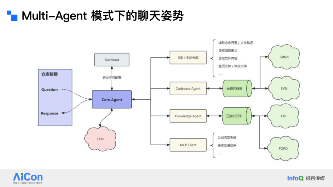 在这种模式下,我们定义了一个核心 Agent(Core Agent)。这个 Agent 与其他架构中的 Agent 类似,能够进行规划和拆解,但最重要的是,我们基于内部工具或内部数据,为它提供了什么样的人员去协调。这一点非常重要。如果你协调的是一个不了解这个项目的人,他可能会给出错误的信息,自然也就很难生成正确的结果。经过我们的治理,很多倾向于项目风格和项目偏好的 Agent 逐渐被定义出来并产生。经过核心 Agent 的协调,并且通过系统提示(system prompt)等方式让核心 Agent 表现得更好,整套体系就会逐渐成熟起来。这就是我们对结合研发空间的多 Agent 系统的思考方式。
