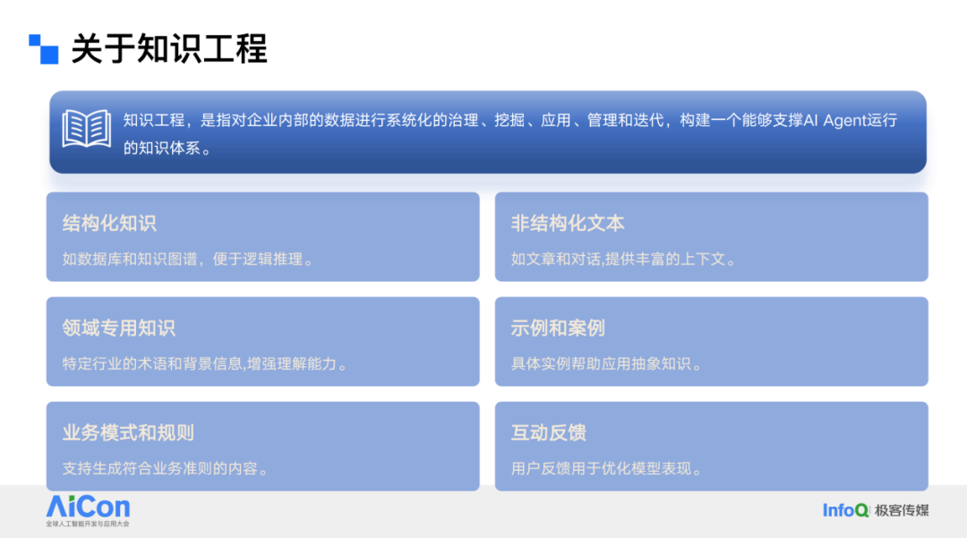 在大模型时代,知识工程指的是对企业内部数据进行系统化的治理、挖掘、应用管理与迭代,构建一个能够支撑 AI Agent 运行的知识体系。这听起来概念简单,但涉及的内容却非常广泛。比如结构化知识,包括游戏中的技能、角色、系统、玩法等,这些都可以定义为一系列结构化数据。同时,也涉及大量非结构化文本,比如角色背后的设计与解释,这些可能以文档形式存在,而在游戏行业,很多策划喜欢用 Excel 管理内容,这些都是非结构化数据。此外,还有领域知识、团队积累的案例,以及潜移默化运行的内部业务模式等,这些对企业来说都是知识,因为它们是你每天可能接触或需要应用的内容,如果你要完成某个实现,就需要了解这些知识。