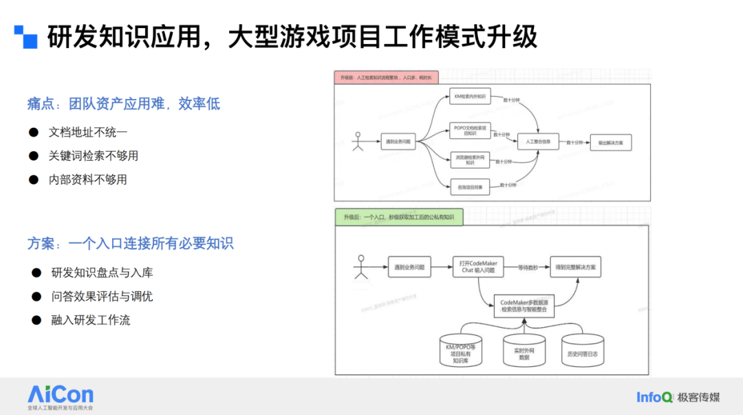 我们还对一些日常问题进行了分类,这些问题远不止开发层面上的,还包括开发技术、公共引擎、游戏设计工具、环境配置,甚至涉及一些项目管理的流程。这是我们建立的模式。最后我想强调一点,如果仅仅完成了第一轮治理,只是把现有数据激活,这是不够的。在实践中我们发现,当大家开始使用这套系统时,会产生使用过程中的数据,这些数据可以进一步回流进来,补充整个团队的知识库。这一点非常重要,我们称之为迭代知识。补充这一环节后,整个知识体系就形成了一个正向循环,知识才能真正“活”起来。以前最大的问题是知识是“死”的,除非你去用它。现在大家已经养成了习惯,要找相关信息就来这里,这样就会产生过程数据,我们可以进一步利用这些数据。