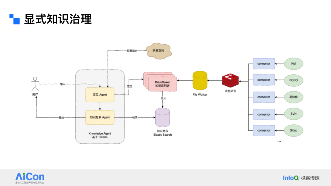 基于前面的讨论,我们可以将知识分为两类。一类是显性知识,即那些即使不问 AI,也可以在文档中找到的知识。在这个过程中,我们主要做的是已有知识的治理。对于内部的知识管理系统、工单系统、代码仓库(如 SVN、GitLab 等),我们都实现了数据的归集,并将其处理进一个统一的知识库,或者说是团队的知识大脑。然后通过 agentic RAG 等方式,实现了对知识的切割、解读和检索。我们最深入的工作是定义 AI Agent,希望通过 AI Agent 的路由,以最高效的方式找到相关数据,这是显性知识治理的过程。