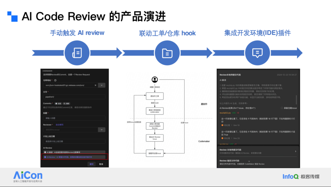 在产品形态上,从早期依赖人工自主发起审查的过程,逐步演进到与我们的流水线集成,甚至与工单系统进行质量门禁。最终,所有信息都集中在一个入口,即 IDE 上。