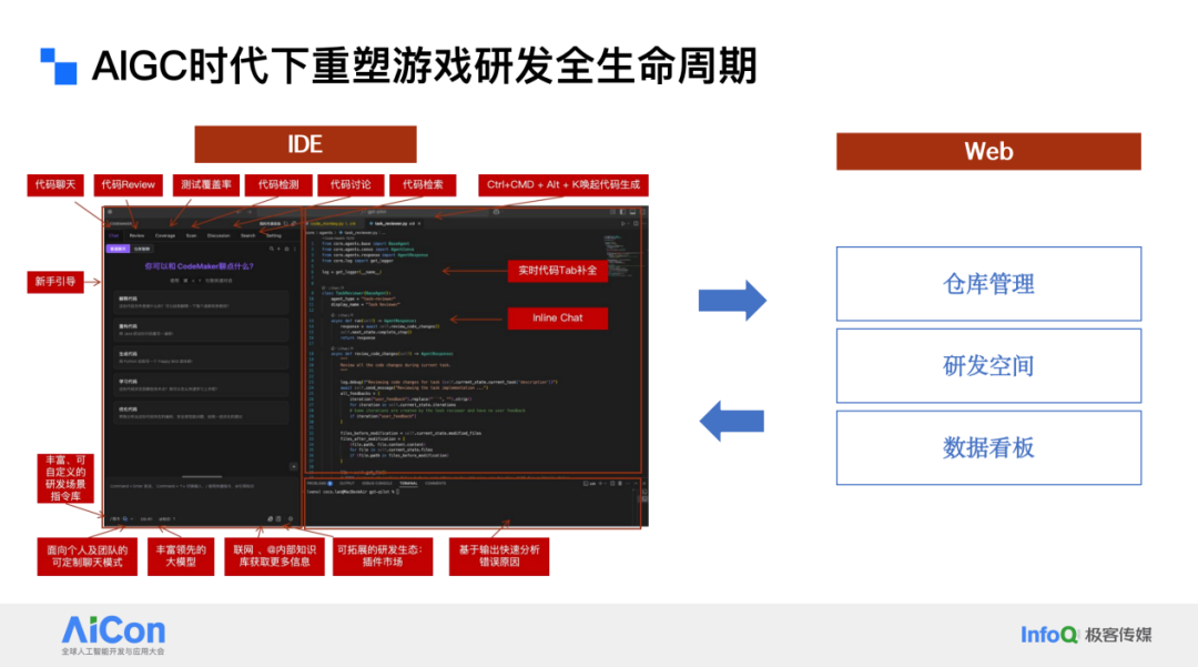 但这些并非重点,重点在于我们利用 AI 赋能的机会,将所有面向程序的工作逐步集中到一个入口,即大家常用的 IDE。我们不希望研发人员每天在不同的地方切换工作,而是希望他们能够在 IDE 中完成所有工作。同时,我们通过 Web 后端形成与 IDE 相互支撑的形态,IDE 的使用情况和数据会回流到后端,而后端配置管理的团队数据也可以在 IDE 中使用,从而将整个游戏研发过程集中到一个入口。