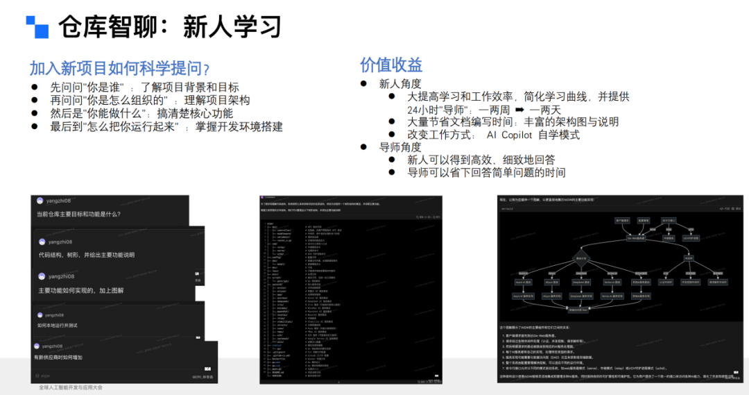 在完成这些工作之后,我们在内部落地的情况也值得分享。首先,我们将整套系统应用到新人学习阶段,形成了一个非常明确的指引。在这种工作模式下,新人应该如何循序渐进地利用这个工具来完成理解?我们有一个实践案例:我给了一个新人 4 万行代码,原本估计他需要两周时间来熟悉,但我告诉他使用这个工具,最后他告诉我只需要一到两天。因为 4 万行代码,说实话,如果你一行一行地去读,或者在没有任何引导的情况下熟悉它,那是一个非常枯燥的过程。但在前期加入团队学习时,你其实不需要这么细致地去了解所有内容,更多的是有人帮你梳理这些内容,让你能够理解整体框架,以及未来你要修改的内容和位置,这些都会有一个清晰的指导。这也间接释放了导师的负担。以前,大家都要一对一地指导新人,现在可以让 AI 来指导新人。