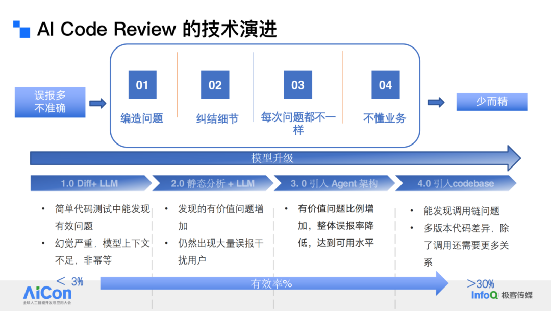 整个技术升级过程其实也经历了几个阶段。最初,大家做 AI 审查时,明确要做的是搞 prompt 工程,让它去发现问题。但结果并不理想,业务团队会抱怨说“搞了 1000 个问题给我,我该怎么去修复和确认呢?”因为可能里面只有 10 个是有效的。第二轮,我们基于双引擎,把静态分析和大模型结合起来,先由静态代码分析过一轮,再由大模型做补充。结果发现,这样发现的问题更多了。