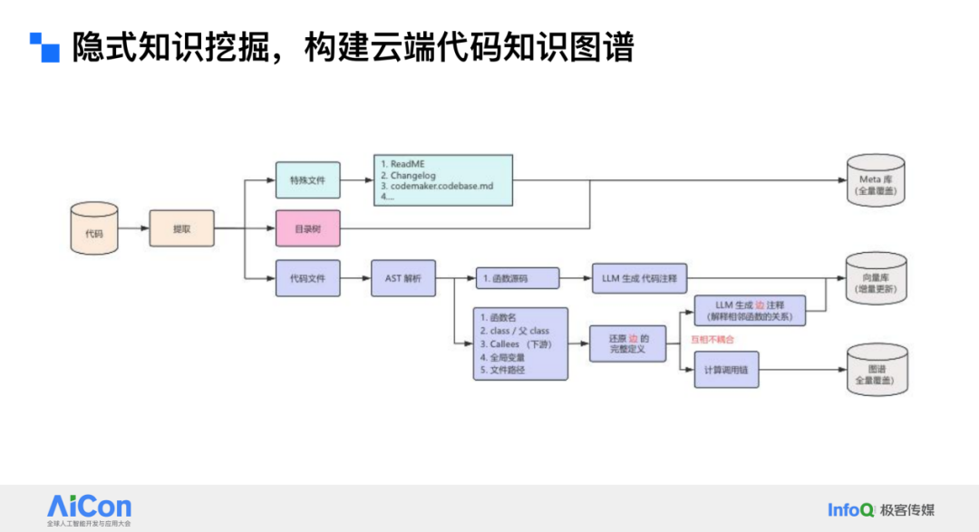 另一部分非常重要的是隐性知识。如果一个开发人员要实现某个功能,他可能每天都在与代码仓库打交道。在这个过程中,我们进行了隐性知识的挖掘。其实一切都在代码里,我们的目标是构建一套代码知识图谱。这里用到的技术其实很传统,只是结合大模型的发展,能够进一步在业务价值上激活。首先,我们对代码目录结构进行了解析,因为代码目录结构对于理解一个工程来说非常重要。其次,我们基于抽象语法树(AST)和调用流,完成了对整个仓库中所有函数甚至所有类的语义化解读,将原本枯燥难懂的代码变成语义上更容易理解的文本。接着,我们挖掘了代码中的调用关系和调用链,形成了一张地图,最终构建了一张完整的代码地图。虽然可视化可以做得非常炫酷,但重点是我们对代码仓库进行了非常精细的解构,让你可以通过聊天的方式获取其中的信息,这是非常重要的一个点。