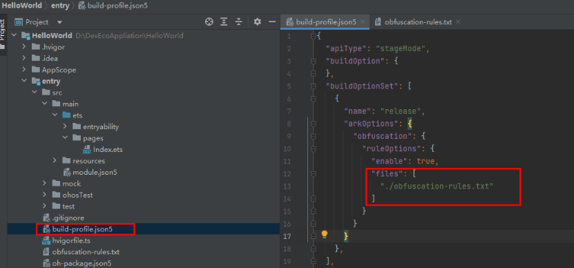 在每个模块下都能找到 build-profile.json5 文件,如下图所示。可以在此文件中配置是否开启混淆及混淆配置文件。