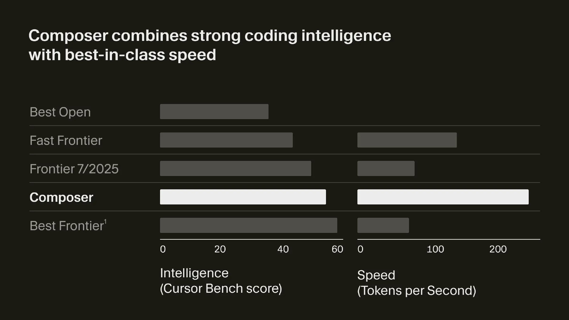 Composer 的最大亮点在于其速度设计目标。他们在公告中称其速度“比同等智能的模型快 4 倍”。模型还专为 Agentic 工作流训练,支持由自主编码代理协同进行的规划、编写、测试与代码审阅。