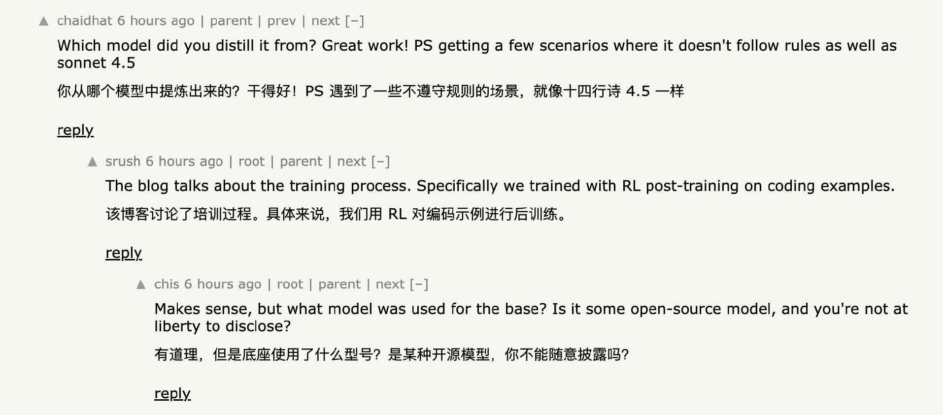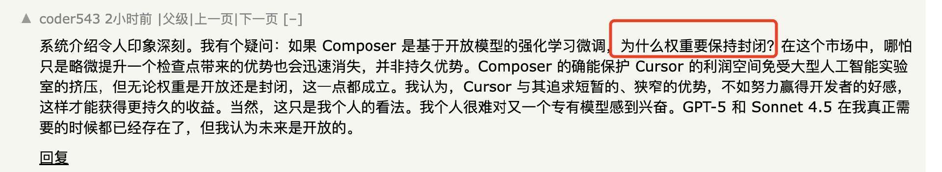 他们的表述里有个关键细节始终不清楚:究竟是从零训练,还是基于已有的开源权重(如 Qwen、GLM)继续训练?Sasha Rush 一直在 Hacker News 回答提问,但至今都回避了关于底座模型的直接问题。有人直问“Composer 是否只是对开源基础模型的微调?”他的答复是:“我们的主要精力放在强化学习的后训练阶段。我们认为,这是让模型成为强互动智能体的最佳路径。”