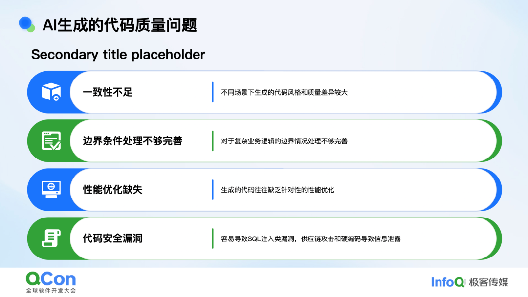 我认为代码质量不足主要体现在几个方面。首先是代码一致性不足。在不同场景下,生成代码的质量和风格存在较大差异。例如,在存量代码仓库中编写代码时,AI 往往会按照自己的风格生成代码,这与现有代码风格不一致。其次,边界条件的处理不够完善。对于复杂业务逻辑的边界情况,AI 生成的代码往往处理得不够充分。此外,生成的代码还存在性能缺失的问题。最后,安全漏洞问题尤为突出,尤其是 SQL 注入类漏洞。斯坦福大学的一项研究指出,AI 生成的代码中存在注入类漏洞的比例约为 45%。