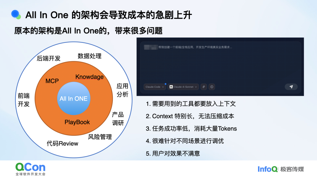 最初,我们采用了一种 All In One 架构,这种架构在建设 Vibe Agent 时带来了诸多问题。当时,Vibe Agent 的核心是一个输入框,围绕这个输入框的是 MCP 工具、知识库(Knowledge)以及各种剧本(Playbook)。这些外围工具构成了一个完整的场景图,涵盖了数据处理、后端开发、前端开发、代码审查、风险管理等多个方面。在这种架构下,所有工具和知识都需要放入上下文中,导致上下文内容异常庞大,成本难以压缩。例如,当时我们使用 Claude 模型执行一个任务,成本高达几百元,这显然是不可持续的。