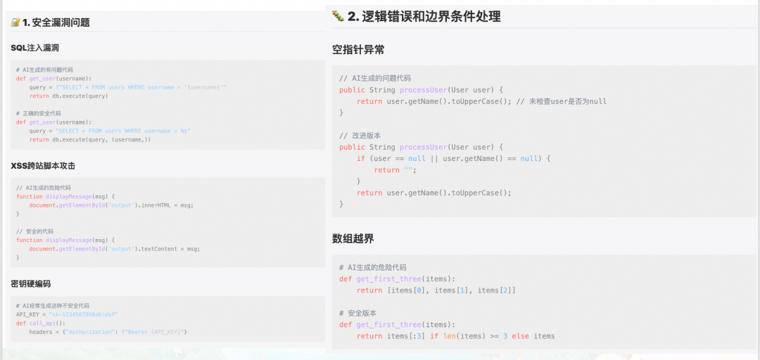 在实际应用中,我们发现了一些典型案例。首先是安全漏洞,包括 SQL 注入和 XSS 攻击。其次是在边界逻辑处理方面,逻辑错误和边界条件处理不当的情况较为常见,例如空指针异常和数组越界等问题,这些都是我们在用户使用过程中观察到的现象。