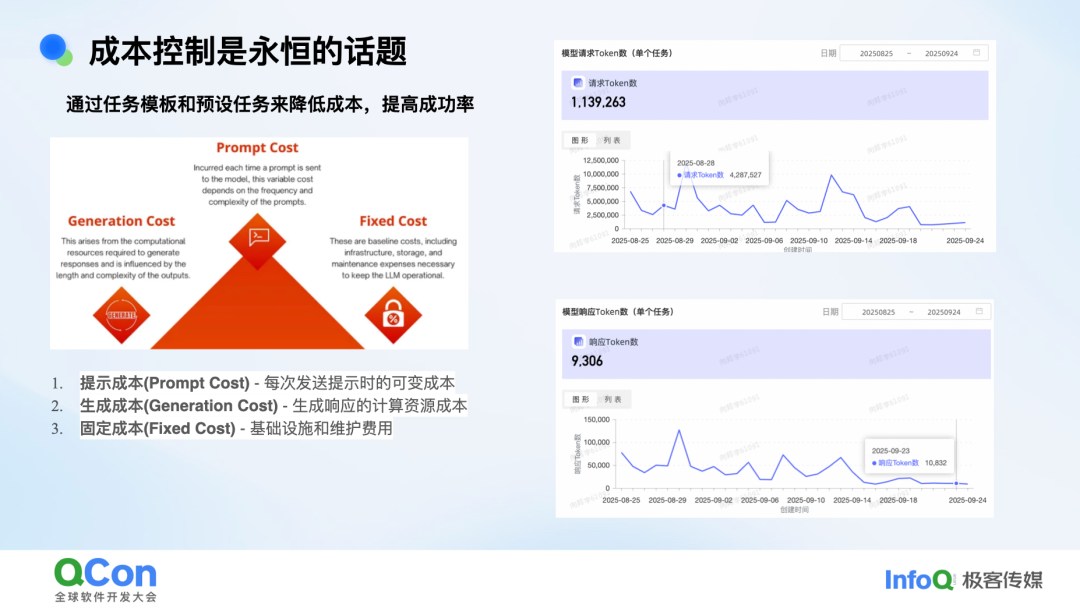 在面对模板和成本过高的问题时,我们采取了一系列措施来优化和解决。最初,我们发现单个任务的 Token 消耗量接近 400 万到 1000 万,这是一个极为严重的问题。为了降低 Token 成本,我们进行了一些操作和设计调整。
