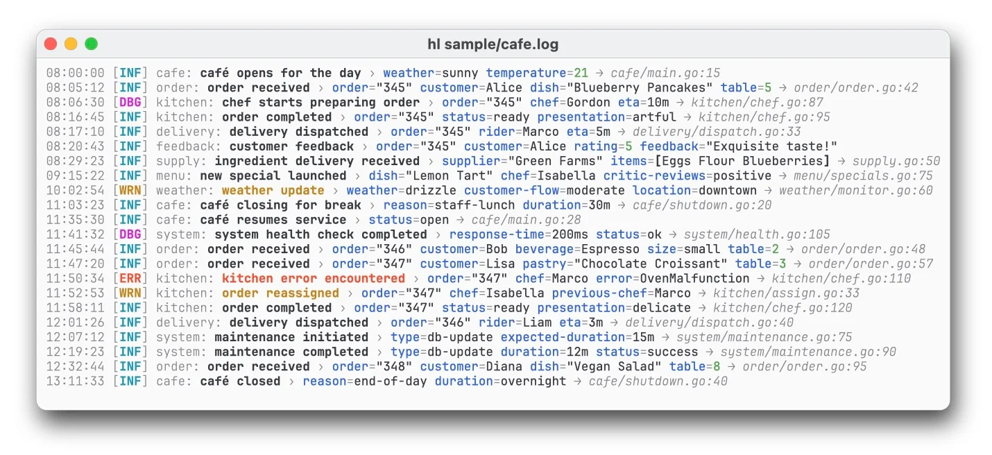 hl 包括一个集成的分页器,类似于 less,可以轻松浏览日志条目。它还提供了一套丰富的功能,用于过滤、搜索、排序和格式化日志。你可以按日志级别(如 error、warn、info 等)过滤,按字段或键值对(如 component=tsdb 或 request.method?!=GET 等)过滤,或者使用时间范围(如 --since 昨天、--since -3h、--until 'Jun 19 11:22:33' 等)过滤。