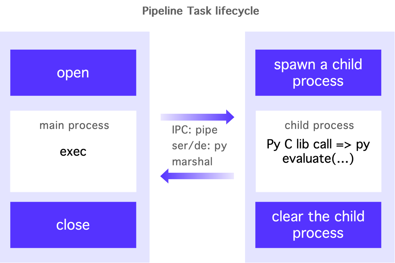 数据传输和序列化:主进程与子进程之间的数据传输通过管道进行。支持 Python 原生对象输入输出的版本采用 Python 的 Marshal 机制进行序列化。
