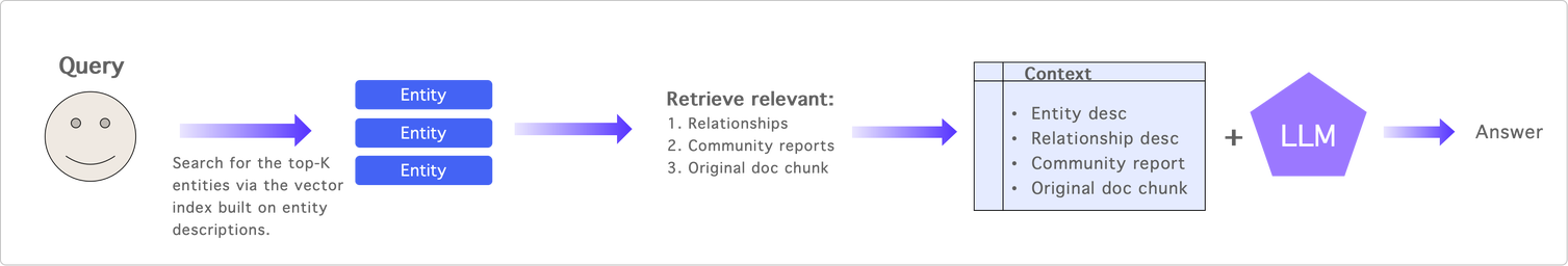 查询阶段:在检索过程中,首先将 Query 转换为向量,该向量用于 Search 实体,以找到与之相关的 Top-K 实体。得到 TopK 实体后,系统将召回它们相关的边,这些边包含与实体相关的描述和信息,以及这些实体关联的报告和原始文档的片段。在有限的上下文内,系统会按优先级拼接相关内容,形成最终上下文,随后将其输入 AI 以生成回答。