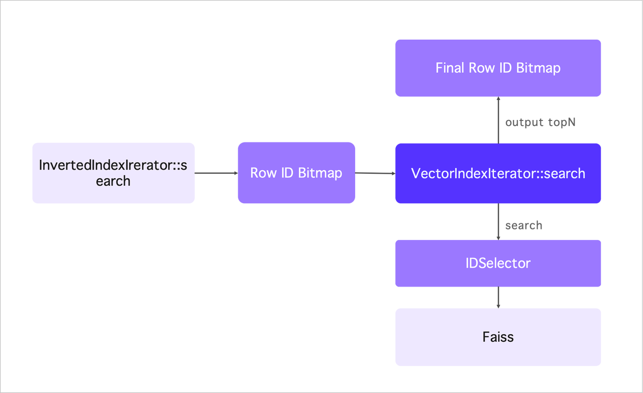 向量索引支持与其他索引条件组合使用。比如,可将倒排索引的结果通过 Faiss 提供 IDSelector 接口传递到底层 ANN 算法实现上以控制搜索过程。基本原理是:倒排索引首先检索匹配行号的 Bitmap,这一 Bitmap 被传递给 Faiss 库。当进行向量搜索时,Faiss 会将搜索范围限制,最终输出 TopN 行号结果,代表融合后的结果集。当倒排索引在第一阶段筛选出的数据量较少时,会跳过向量索引进行暴力计算,这样耗时更短、时间更精准。