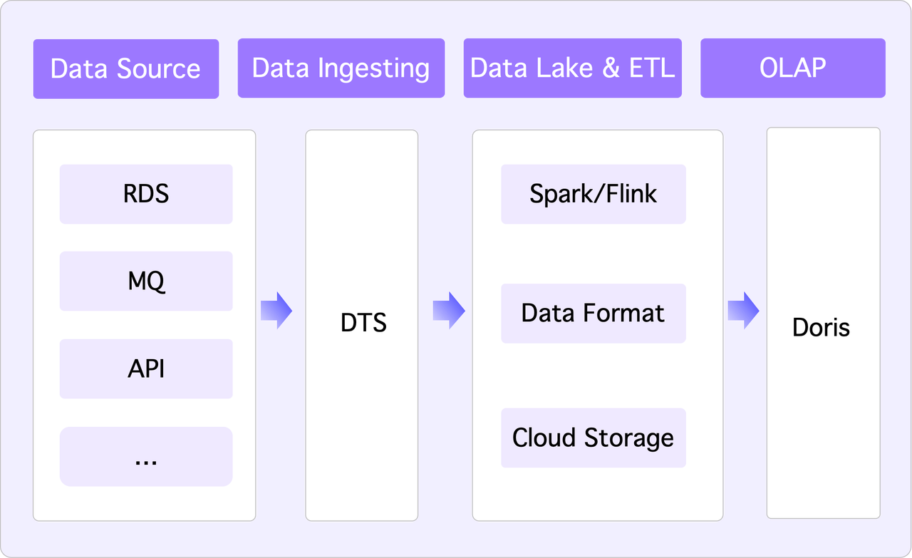 首先,我们基于 Doris 构建了湖仓一体的数据架构,以数据湖为中心,外部业务系统或企业内部信息系统(如 RDS、API 取数),数据经过 DTS 等工具摄入,最终沉淀在云存储中,呈现为传统 Hive 的原生 Parquet 格式。随后,数据通过 Spark 或 Flink 进行 ETL 清洗,遵循标准的 Lambda 架构,最终生成可供消费的数据,并存储至 OLAP 引擎 Apache Doris 以实现查询加速。