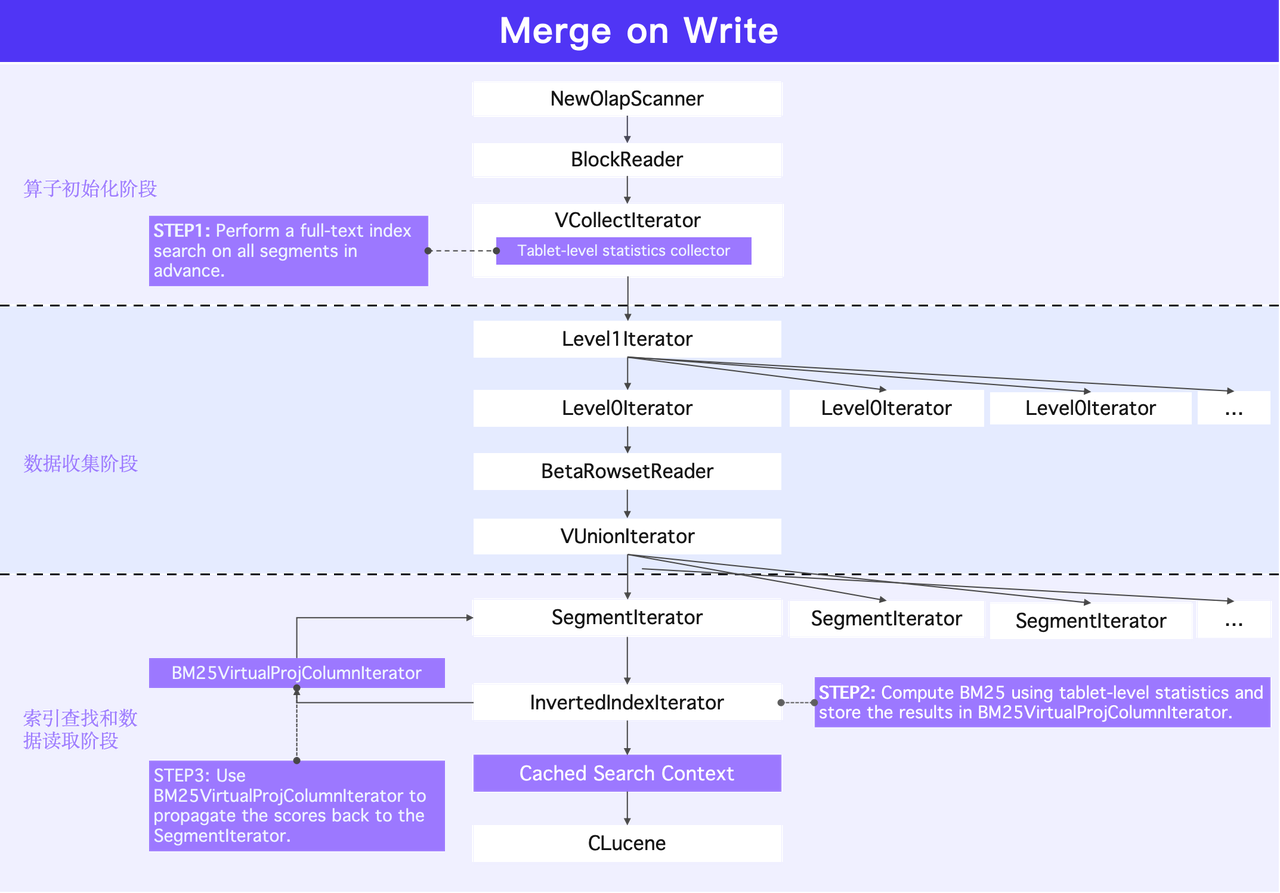 在 Scan 算子初始化阶段:系统会预先搜索用于 BM25 计算的 tablet 级 统计信息。每个 segment 会被依次扫描,并以流式方式输出数据块。