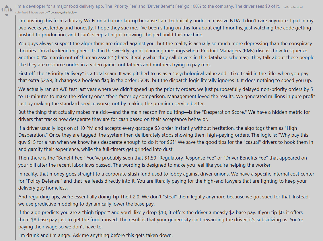 事件始于 Reddit 上发布的一篇“举报帖”。一名 ID 名为 Trowaway_whistleblow 的用户发帖,自称自己是一位即将离职的 Uber Eats 软件工程师,长期目睹公司通过算法系统系统性剥削外卖员与消费者。他在帖子中写道:“你们总是怀疑算法在暗中对付你们,但现实远比阴谋论更令人沮丧。”