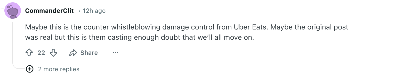 “或许这是 Uber Eats 为了平息事态而采取的反举报策略。或许最初的帖子是真的,但他们这么做是为了制造足够的疑点,让我们最终都释怀。”
