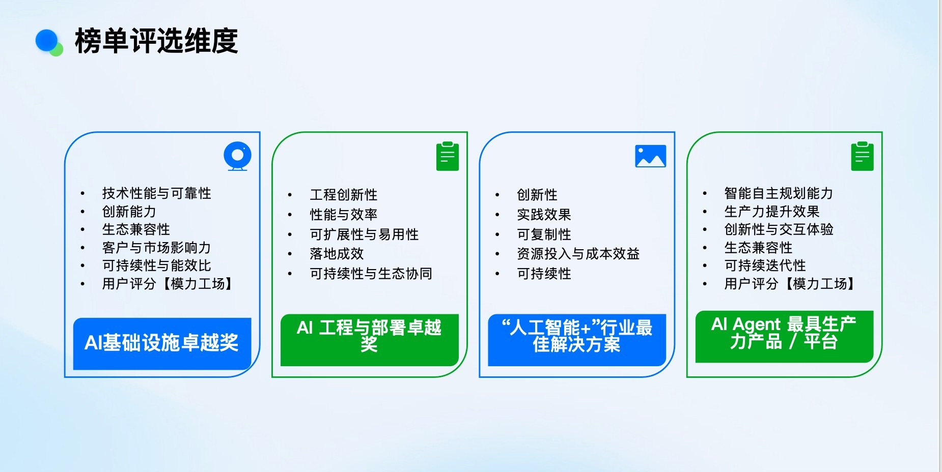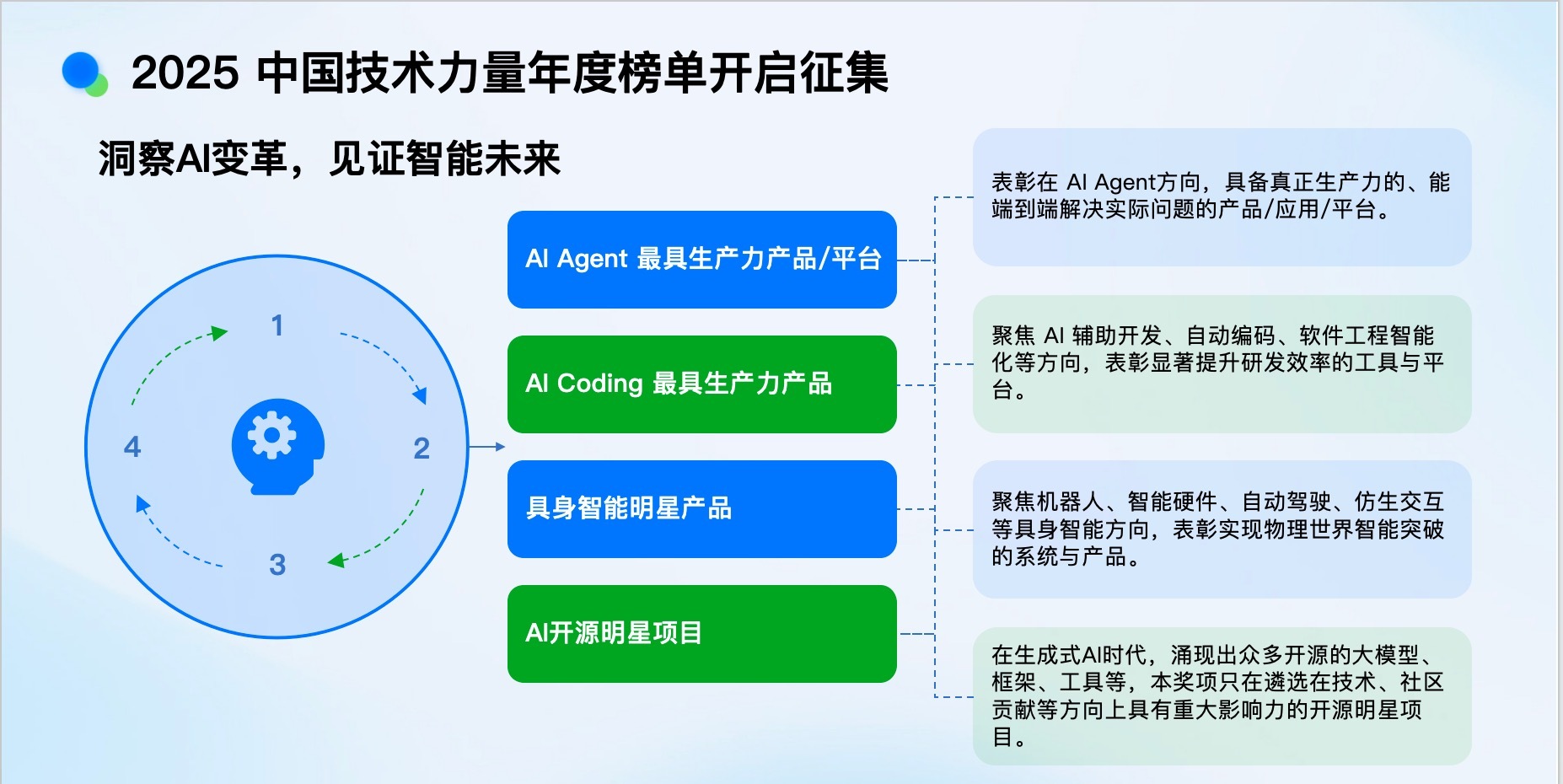 具体包括八个榜单类别:2025 年度 AI 基础设施卓越奖 TOP20、2025 年度 AI 工程与部署卓越奖 TOP20、“人工智能+”行业最佳解决/落地方案 TOP20、AI Agent 最具生产力产品/应用/平台 TOP15、Data & AI 最具价值产品/平台 TOP10、AI Coding 最具生产力产品 TOP5、具身智能明星产品 TOP10、AI 开源明星项目 TOP10。