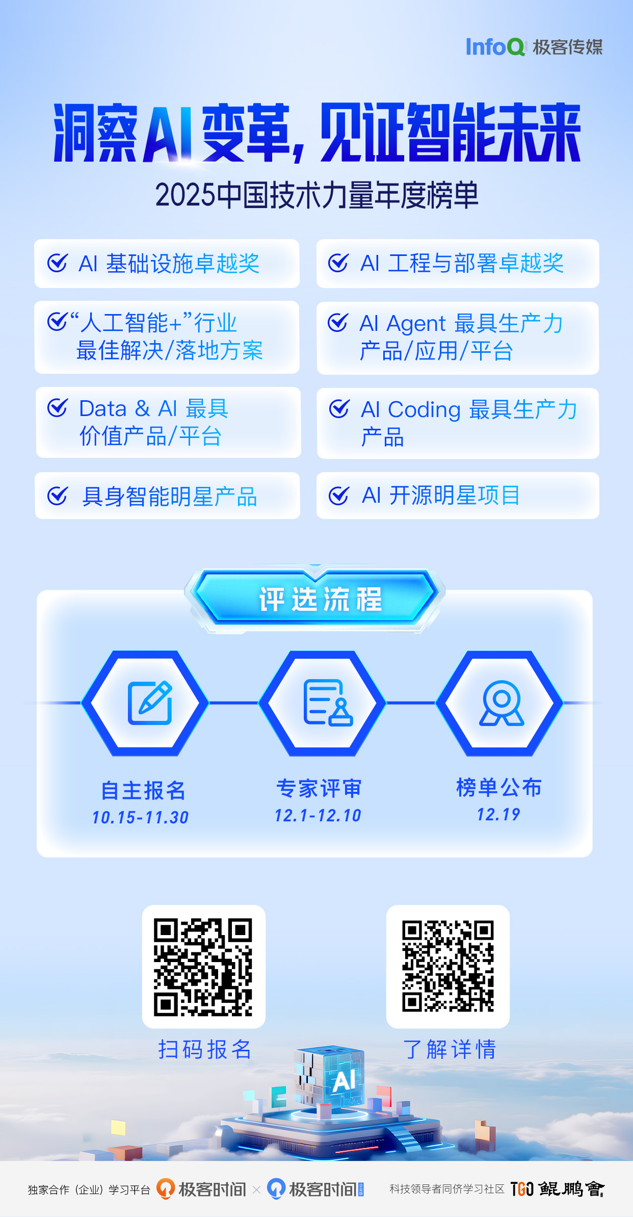 基于上述背景,InfoQ 极客传媒携手模力工场正式发起2025中国技术力量年度榜单评选。这也是我们连续第五年进行榜单评选了,基本每年都能收到来自 100 多家企业的案例申报。