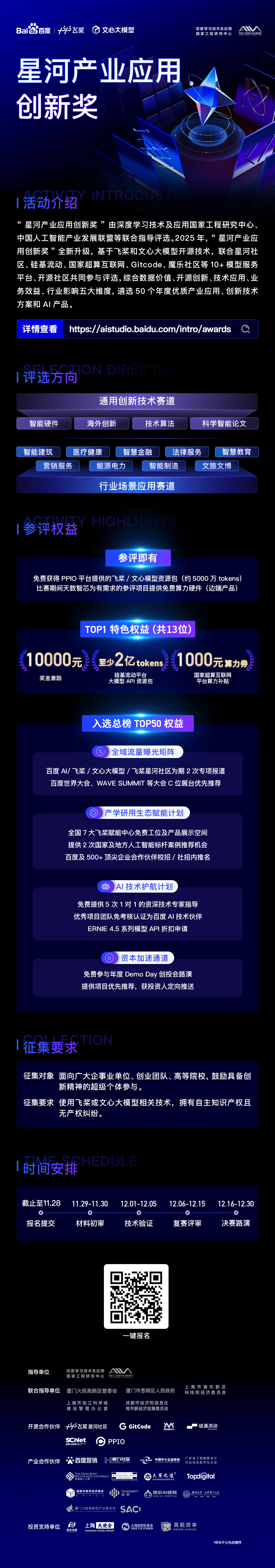 模型资源:参赛团队可免费获得 PPIO 派欧云平台提供的飞桨/文心系列模型资源包(约 5000 万 tokens);