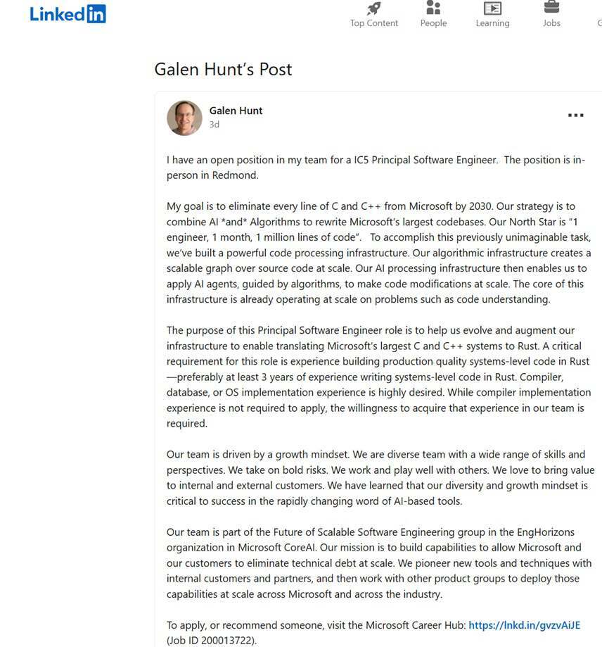最初宣称将配合 AI 使用 Rust 语言替代 C/C++的 Galen Hunt 本人,随后则在这篇 LinkedIn 帖子中补充称:“这篇帖子引发的关注远超预期,也引发了大量过度解读……我特此澄清:我们不会配合 AI 用 Rust 语言重写 Windows 系统。”