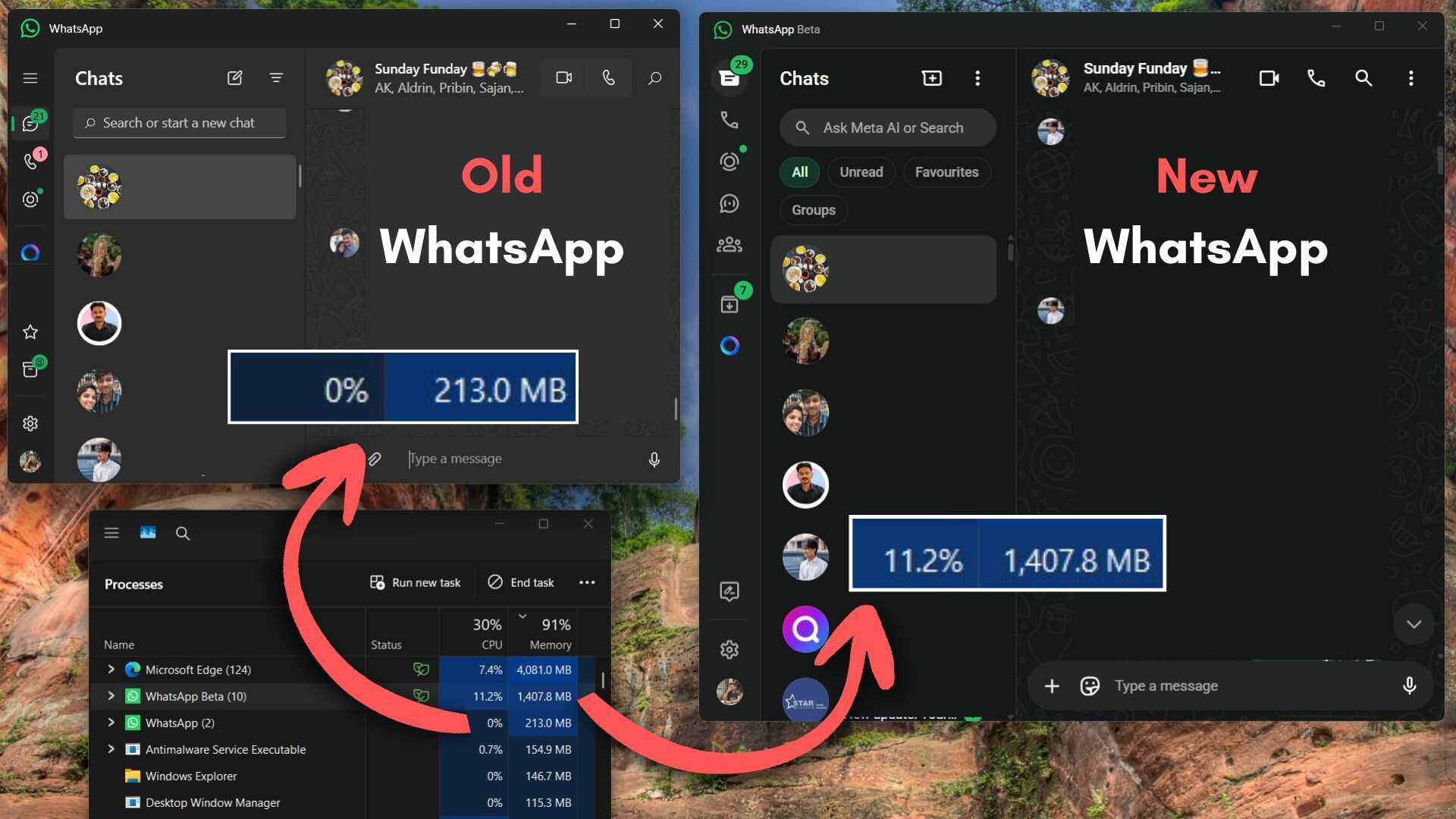 原生版 WhatsApp 当然称不上完美无缺,但其内存占用不足 200 MB,动画更加流畅丝滑、加载速度也更快。遗憾的是,Meta 在裁员中解散了其原生客户端开发团队,转而采用基于 WebView2 的解决方案——此方案的内存占用高达旧版原生客户端的七倍。