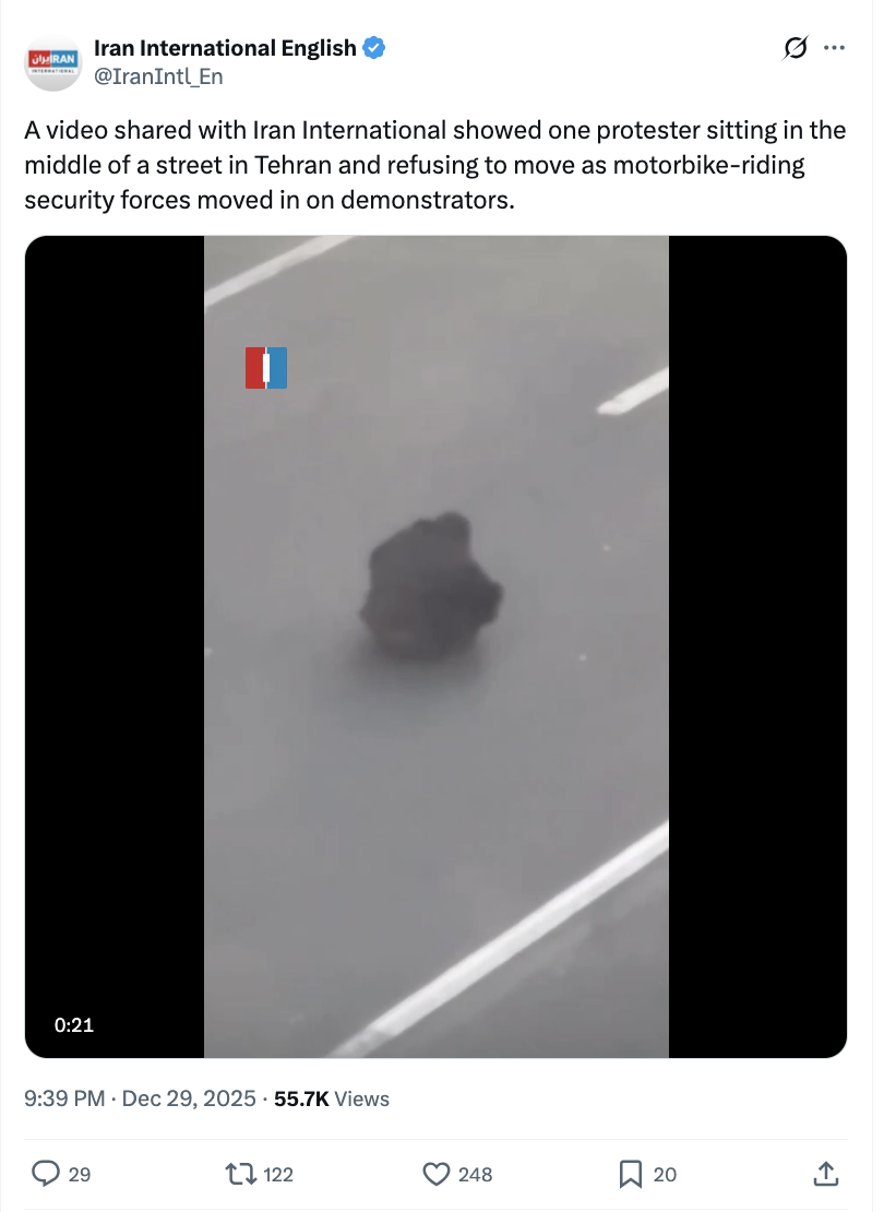 一个典型案例发生在抗议爆发后的第二天:一段在德黑兰拍摄的低清视频中,一名抗议者坐在街道中央,面对安保力量。该事件已被多方核实确认属实。