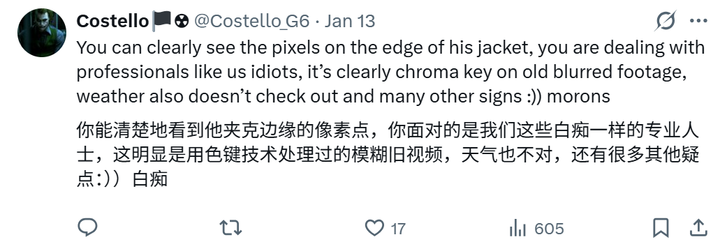 但随着视频在网络上不断传播,出现了经过 AI 增强画质的版本。BBC 波斯语记者 Hossein Bastani 发布了这段清晰版视频,但未注意到其已被 AI 处理。支持伊朗官方的相关账号随即抓住这一点,将 AI 修图留下的痕迹当作“证据”,以此否定这张照片和其他抗议影像的真实性。