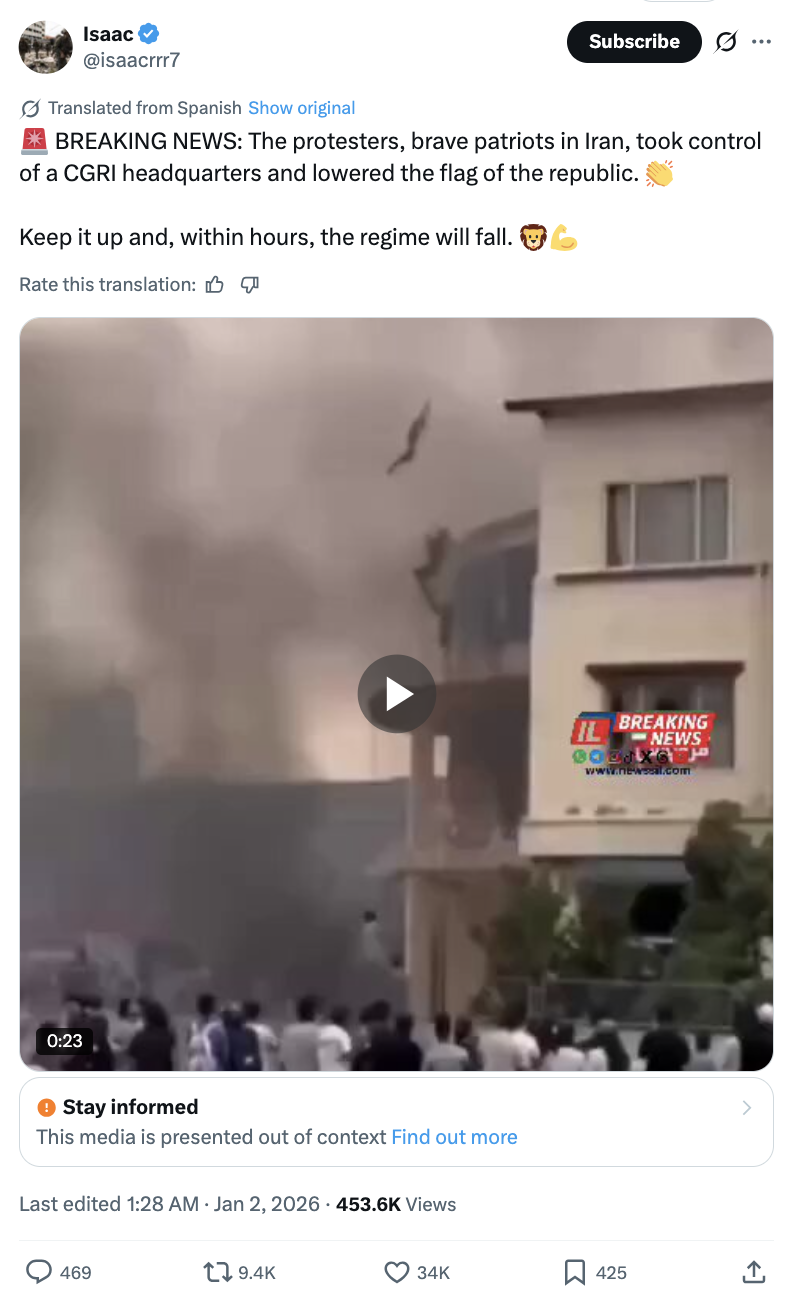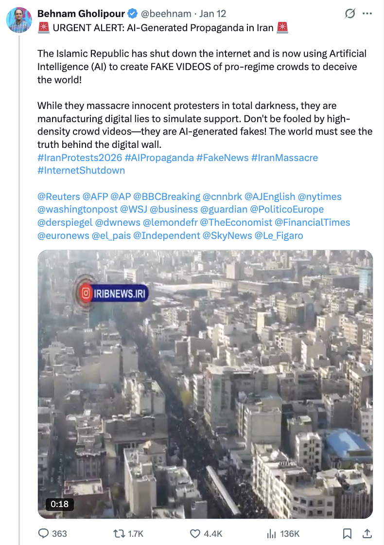 Mahsa Alimardani 回忆称,集会自 12 月 28 日爆发后仅数小时,伊朗当局相关账号就开始将抗议现场的真实影像贴上“AI 伪造”的标签。