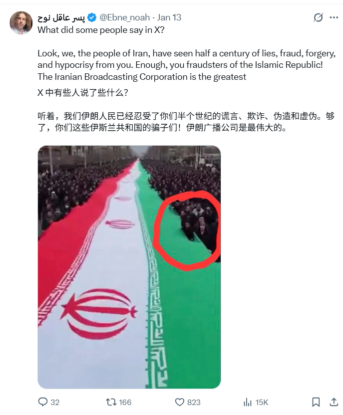 网民和非营利组织通过自发事实核查发现,伊朗官方发布了使用后期编辑和 AI 生成影像,刻意营造了“反骚乱”的舆论氛围。这类内容在 X 平台上获得了数万次观看。