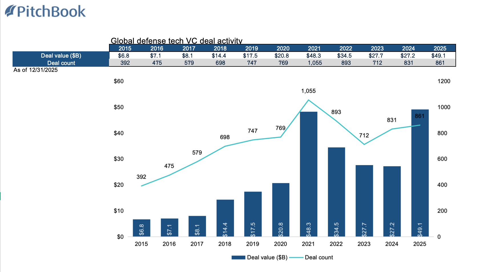 从资金流向上看,这并非零星现象。根据 PitchBook 数据,全球防务科技的风险投资在过去十年持续抬升,并在近两轮战争节点出现明显跃升。