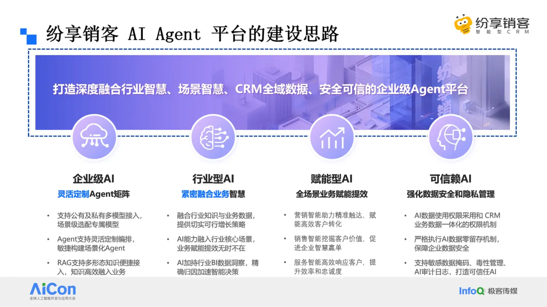 纷享销客技术总监王毅在 AICon 2025 深圳的分享《纷享销客企业级 SaaS 服务 AI Agent 平台落地实践》,结合在营销获客、销售转化、客户服务、海外客户支持等场景的实践探索,拆解企业级 AI 从需求定位、架构设计到落地突破的完整思考过程。