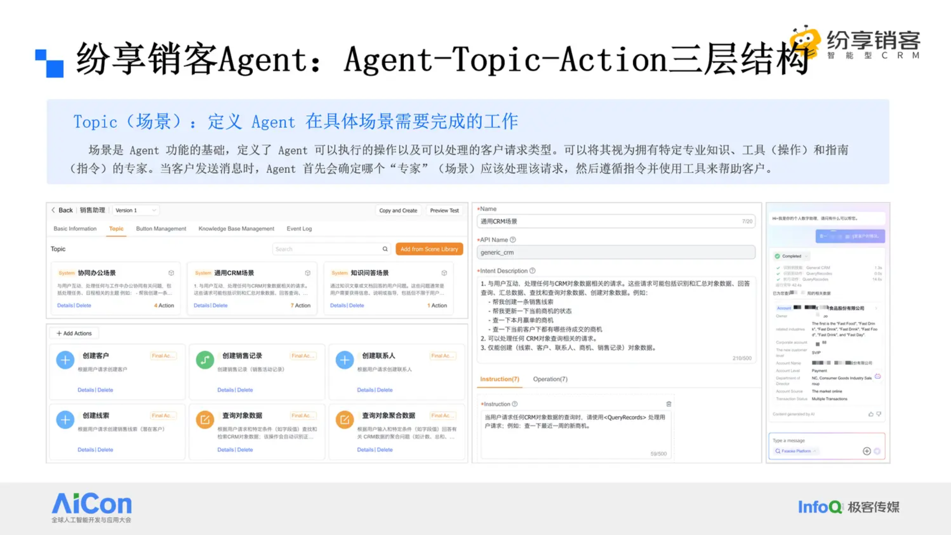 应用层作为技术与业务的连接入口,聚焦营销、销售、服务等核心场景实现价值转化。从快消行业的 "AI 语音下单" 到制造业的 "上下游业务协同",再到智能客服、商机推荐等通用场景,展现了 AI 能力与行业场景的适配实践。演讲中提及的 Agent-Topic-Action 三层结构设计,通过 "总控中枢 - 场景规则 - 功能调用" 的专业分工,解决了工具冗余问题,实现场景能力的快速复用,为缩短 AI 应用落地周期提供了具体方法。