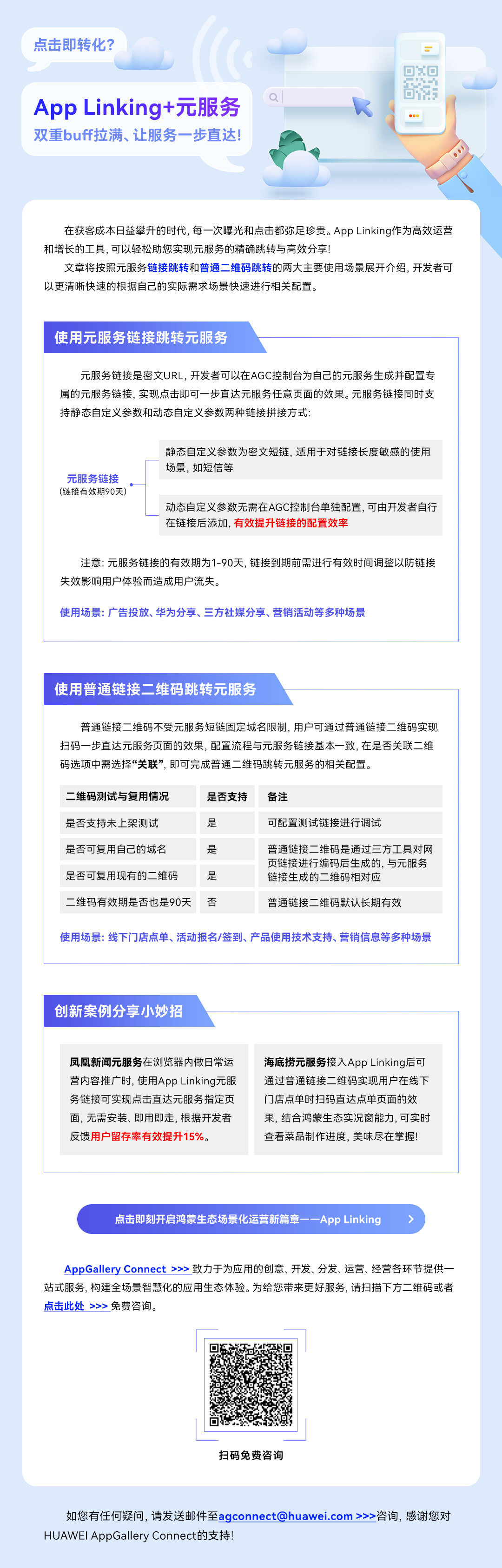 在获客成本日益攀升的今天,每一次曝光与点击都弥足珍贵。如何让每一次用户触达都精准转化为有效访问?App Linking 正是您实现高效运营与增长的核心利器!1.元服务链接跳转:链接直达服务深处,缩短用户访问路径;2.普通链接二维码跳转:兼容各类二维码场景,灵活适配不同需求。立即扫码,解锁精准跳转的运营新技能!