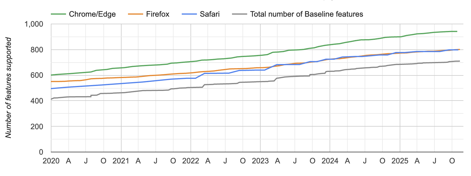 Baseline 特性的稳定年度增长,通过Web平台状态站点观测。