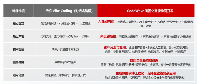 基于对企业级需求的深入洞察,CodeWave 提出了“可控的 AI coding”定位:不做通用 C 端工具,而是将 AI 能力与原有开发底座融合,聚焦企业级复杂应用,实现“提效”与“可控”的平衡。