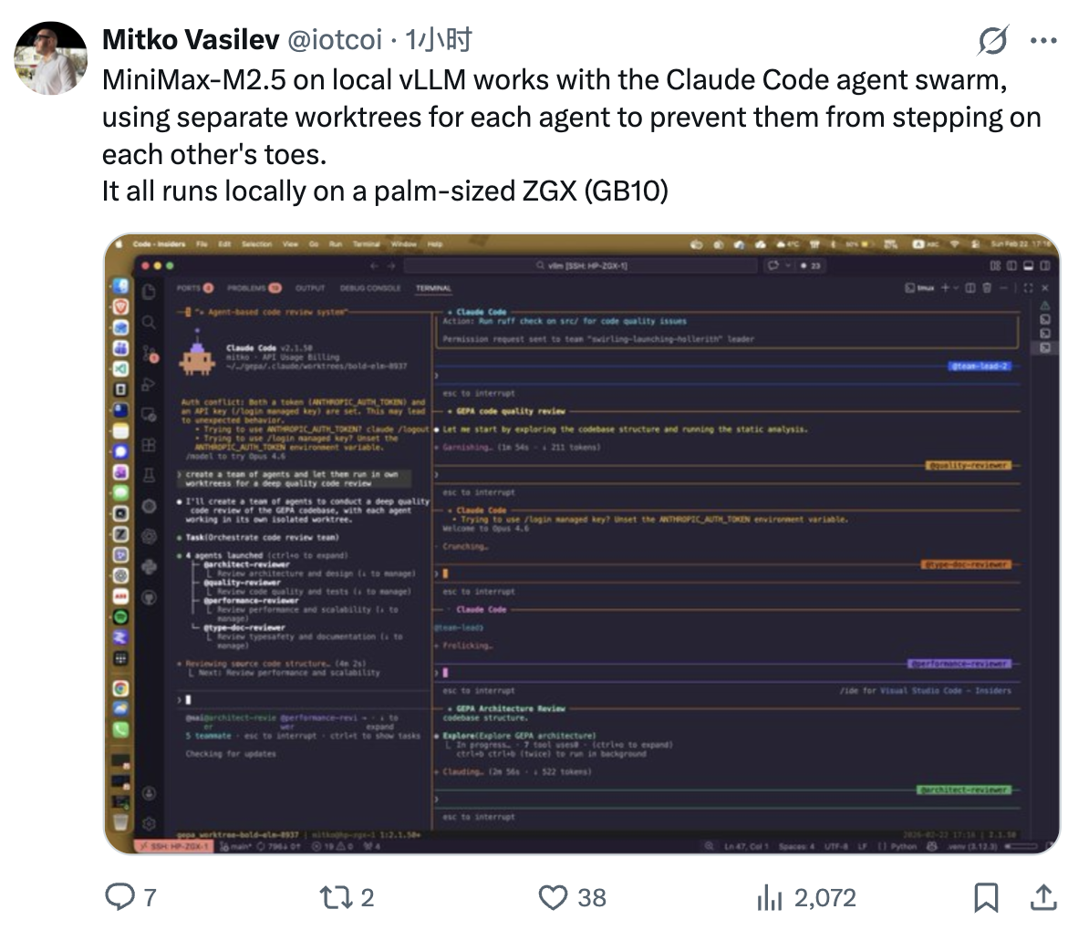 现在,M2.5 已被这位开发者作为日常主力模型使用。在本地 vLLM 推理框架支持下,MiniMax-M2.5 可以与 “Claude Code” 多智能体系统协同运行。为避免不同智能体在代码修改与上下文管理中产生冲突,他为每个智能体划分了彼此隔离的独立工作区,从而维持并发任务执行的稳定性。