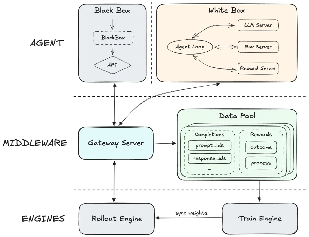 中间件抽象层承担系统隔离与通信标准化的角色。Gateway Server 负责处理 Agent 与模型之间的交互请求,通过统一协议屏蔽模型差异;Data Pool 则以异步方式收集交互轨迹与过程信号,作为生成与训练之间的缓冲与调度枢纽。训练与推理引擎分别承担策略生成与模型更新职责,前者聚焦高吞吐 Token 生成,后者通过调度机制持续更新策略分布并与采样过程保持同步。