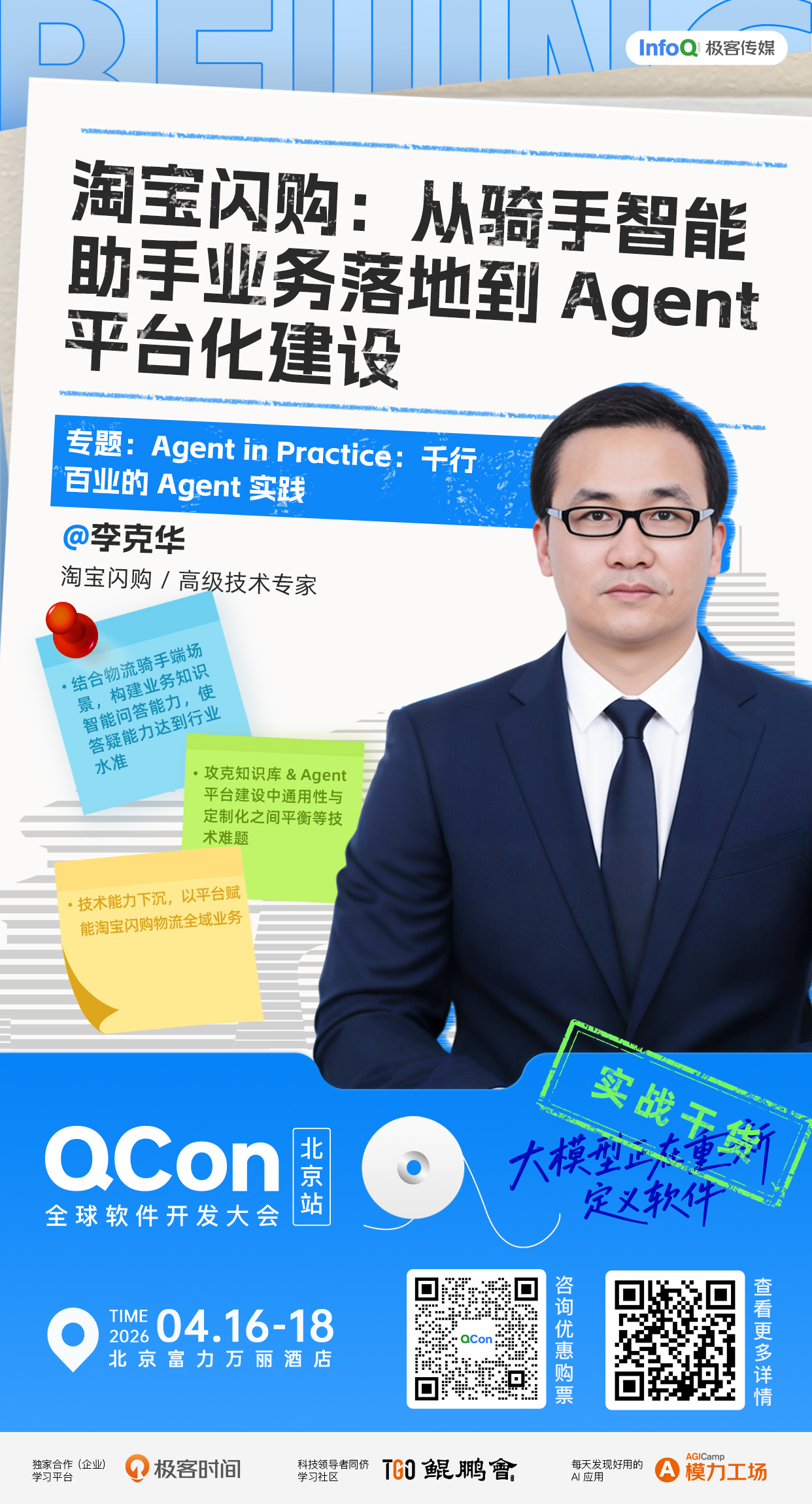 4 月 16 日-4 月 18 日,QCon 全球软件开发大会将在北京举办。本届大会锚定 Agentic AI 时代的软件工程重塑,聚焦 Agentic AI、多智能体协作、算力优化、技术债治理、多模态和 AI 原生基础设施等前沿话题,邀请来自腾讯、阿里、百度、华为、蚂蚁、小米、网易等企业技术专家,带来百余项真实落地案例,系统性分享前沿洞察与实战干货,以技术共创探索 AI 落地新路径。