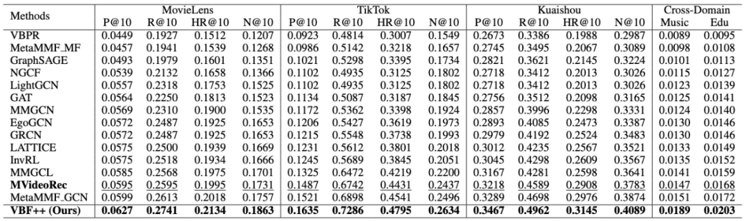 全面 SOTA:VBF++ 在所有数据集和指标上均超越了包括 LightGCN、MMGCN、LATTICE 等 14 种现有的基线方法。