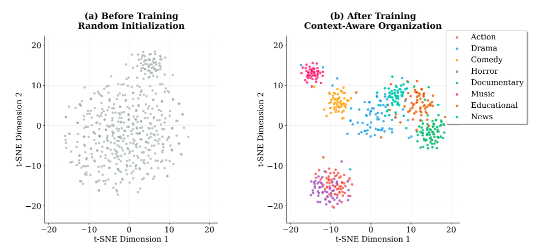 效果验证:训练后的策略在潜在空间中自动聚类成明显的语义群组(见图 2),且这种聚类与视频内容高度一致(见图 3):