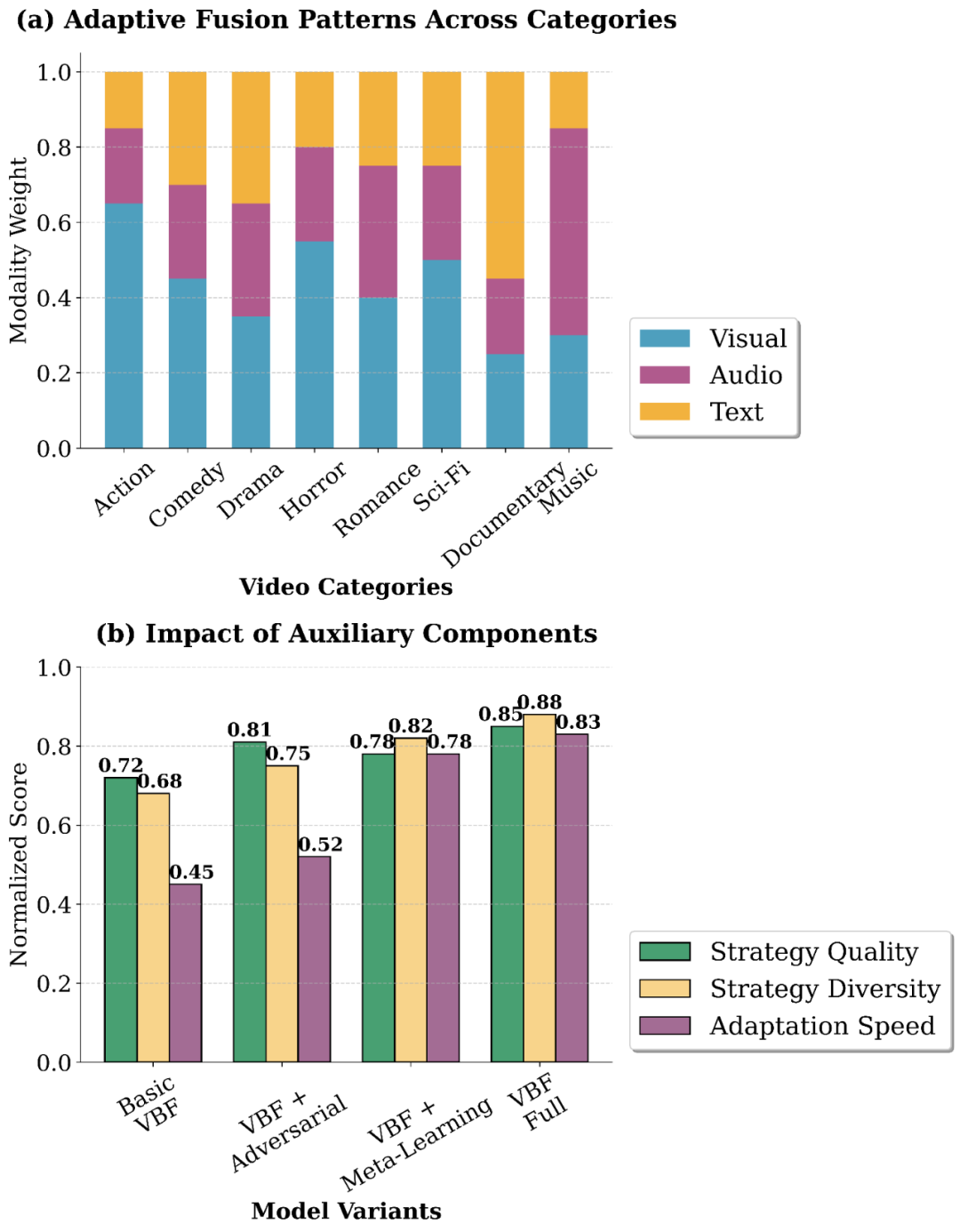 动作类视频自动赋予视觉模态更高权重(平均 0.68)。