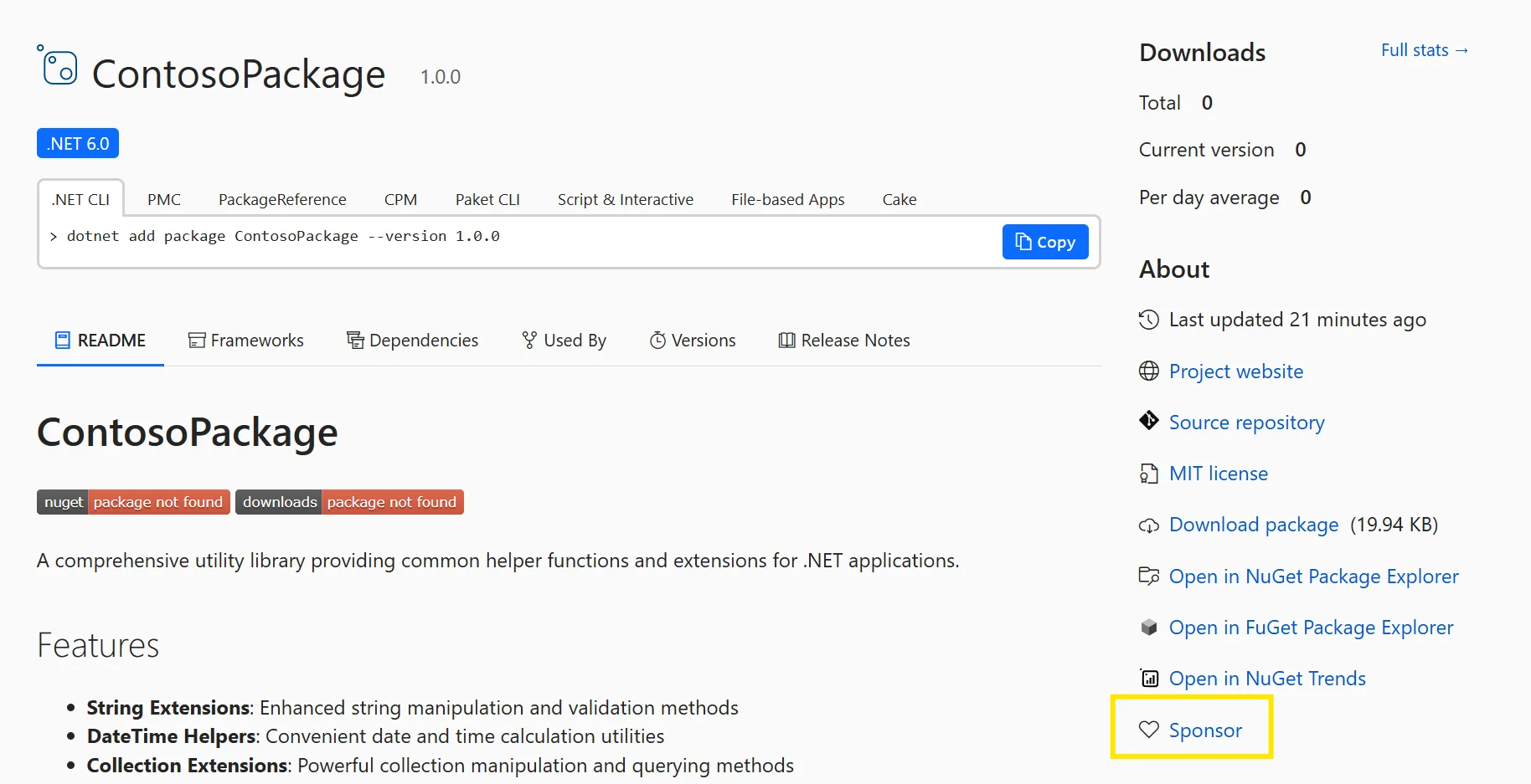 Nuget.org 上的赞助按钮,图片来源:微软官方开发博客
