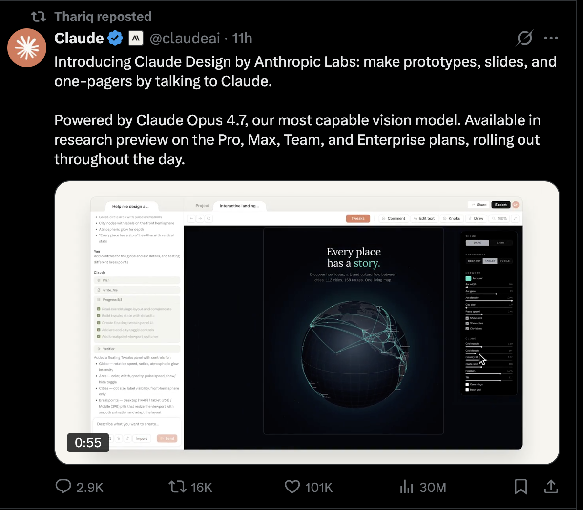 还有用户表示,试过 Claude Design 后发现它真绝了。该用户让 Claude Code、Codex、Gemini 等系统都存在于同一个无限画布上。无需切换上下文。